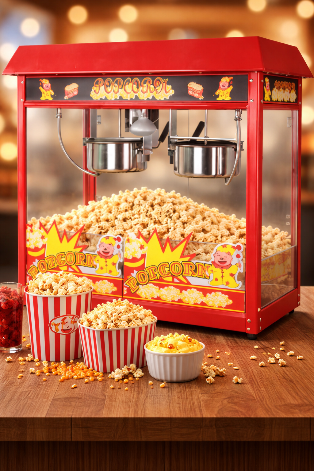 מכשיר פופקורן כפול – דלתות זכוכית אדום 8oz+8oz מידות: רוחב 92 עומק 42 גובה 76