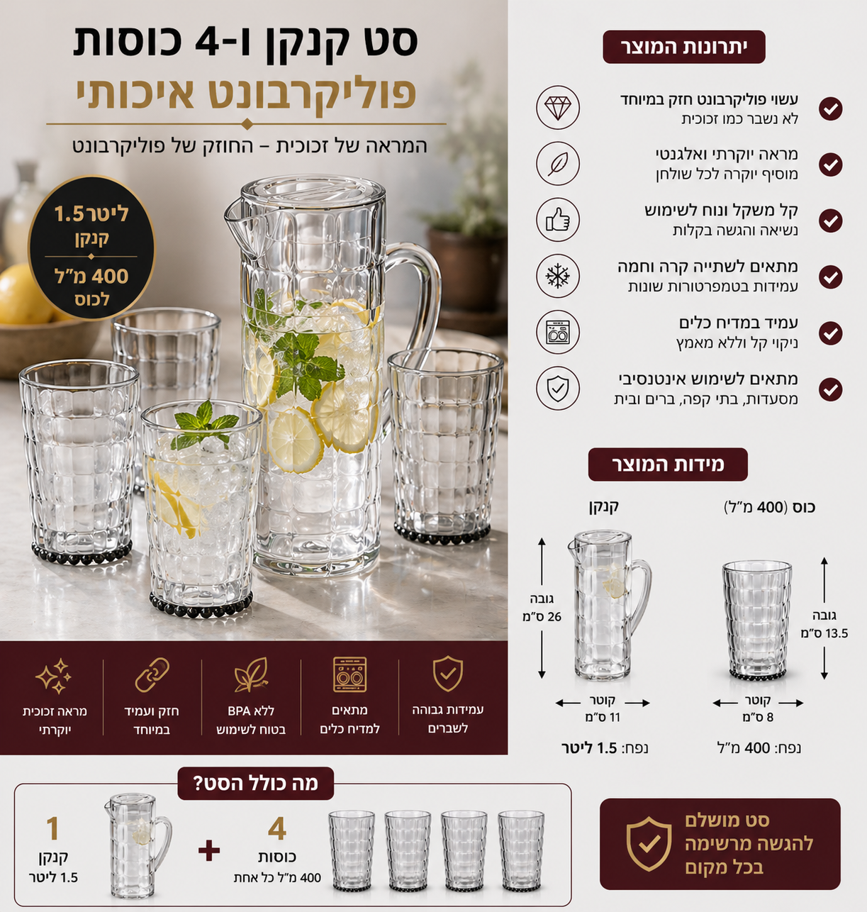 סט 4 כוסות שתיה עם קנקן פוליקרבונט מרהיב אפור